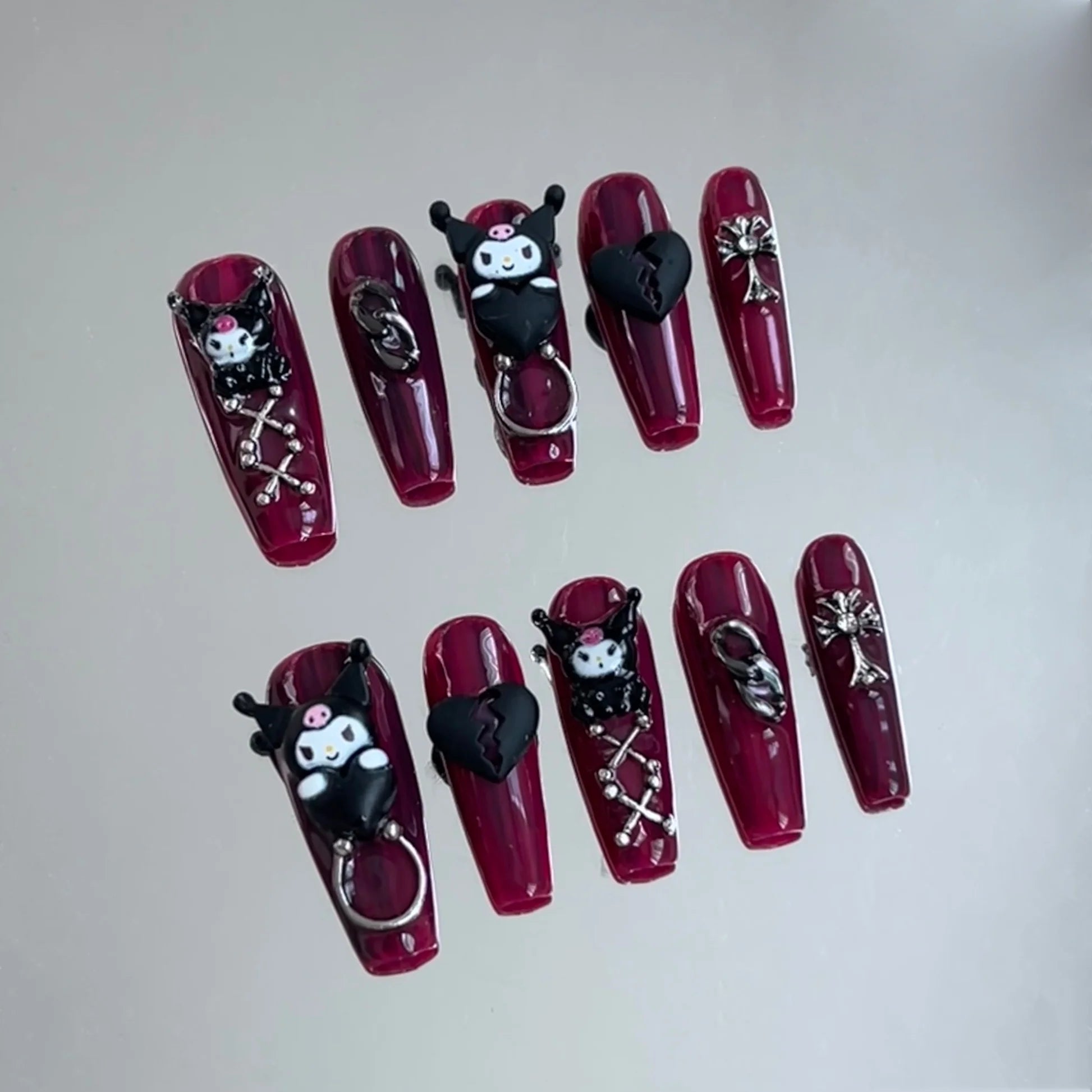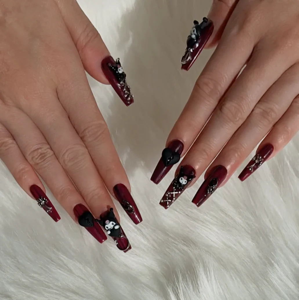 Gothic Fairy Story: Deep crimson meets dark enchantment, adorned with edgy black patterns and mischievous little demons. A mysterious tale of allure and rebellion, painted on your fingertips.