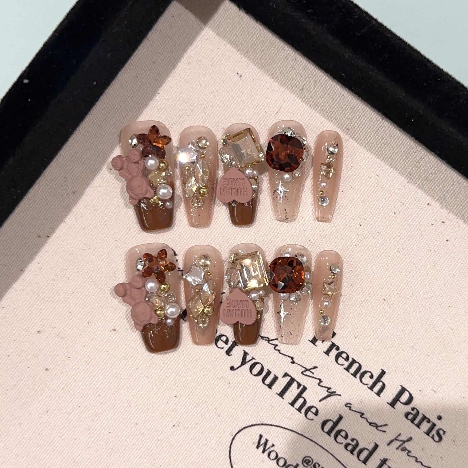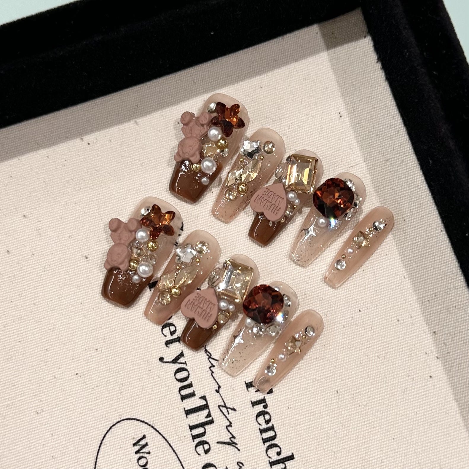 Starry Cocoa:Beneath a soft cocoa sky, shimmering stars and golden dewdrops come alive, while chocolate Teddy and tender hearts weave a dreamy tale of love. Each press unveils a world where elegance meets whimsy, a touch of magic for your fingertips.