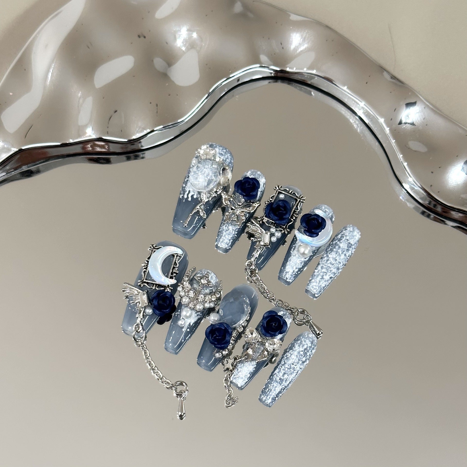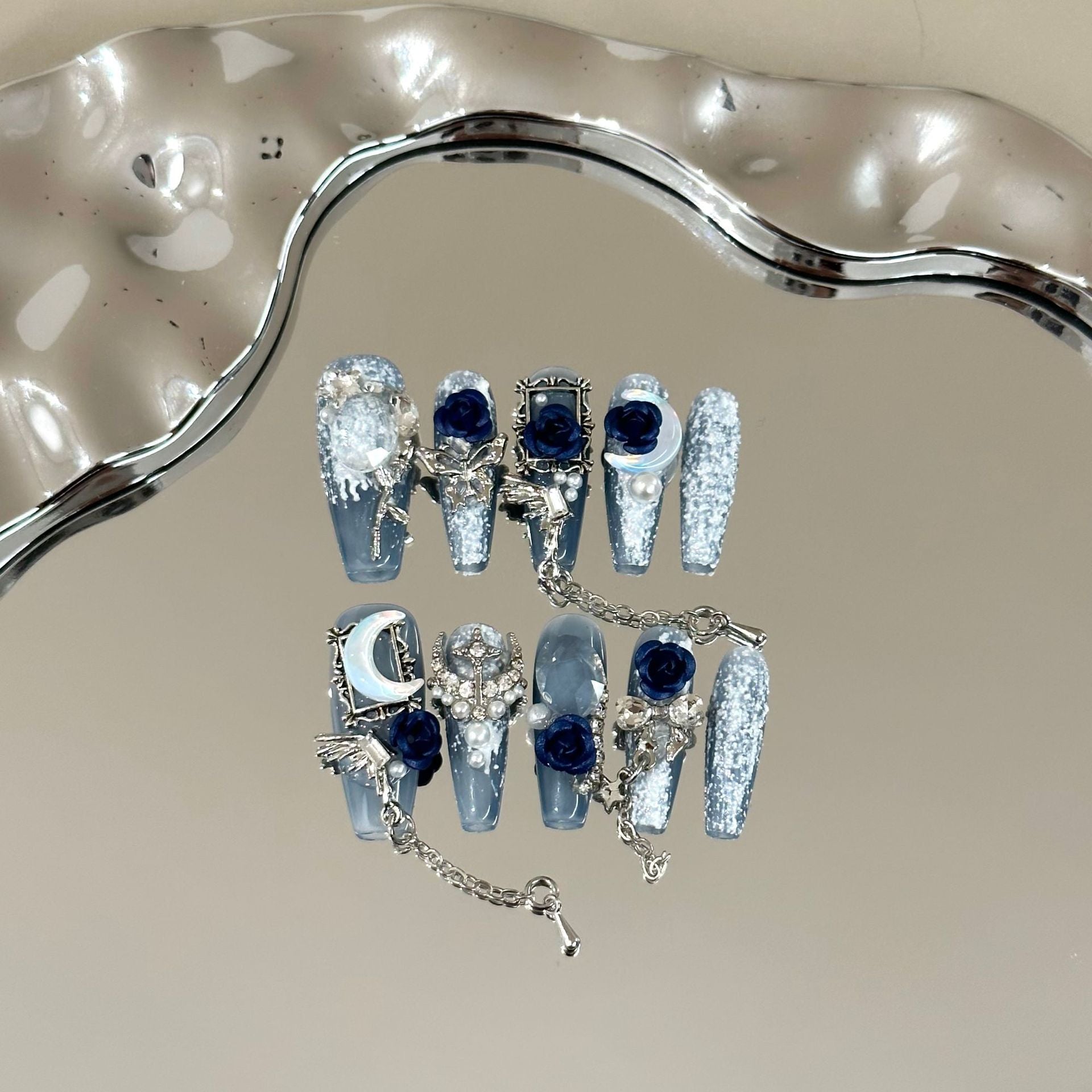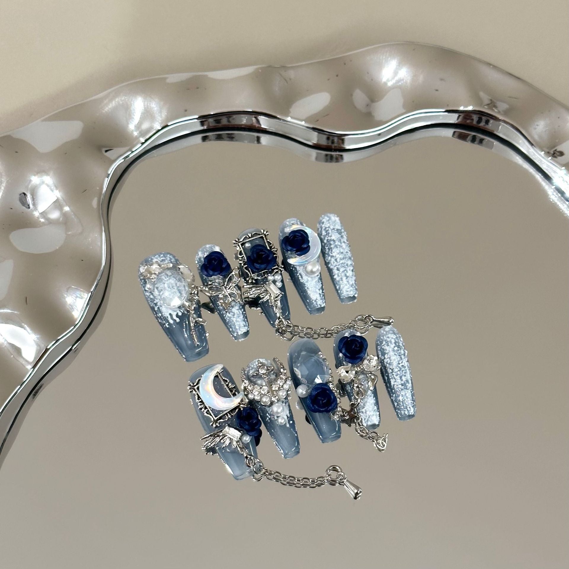 A frost-kissed dream of icy blue camellia and moons, shimmering pearls, and silver butterflies. Handcrafted elegance, cool yet enchanting. Pure artistry at your fingertips.