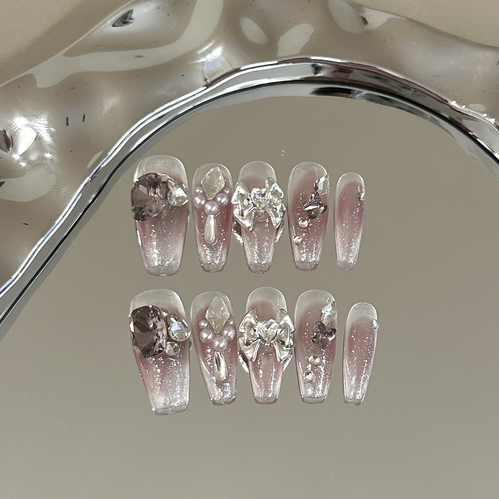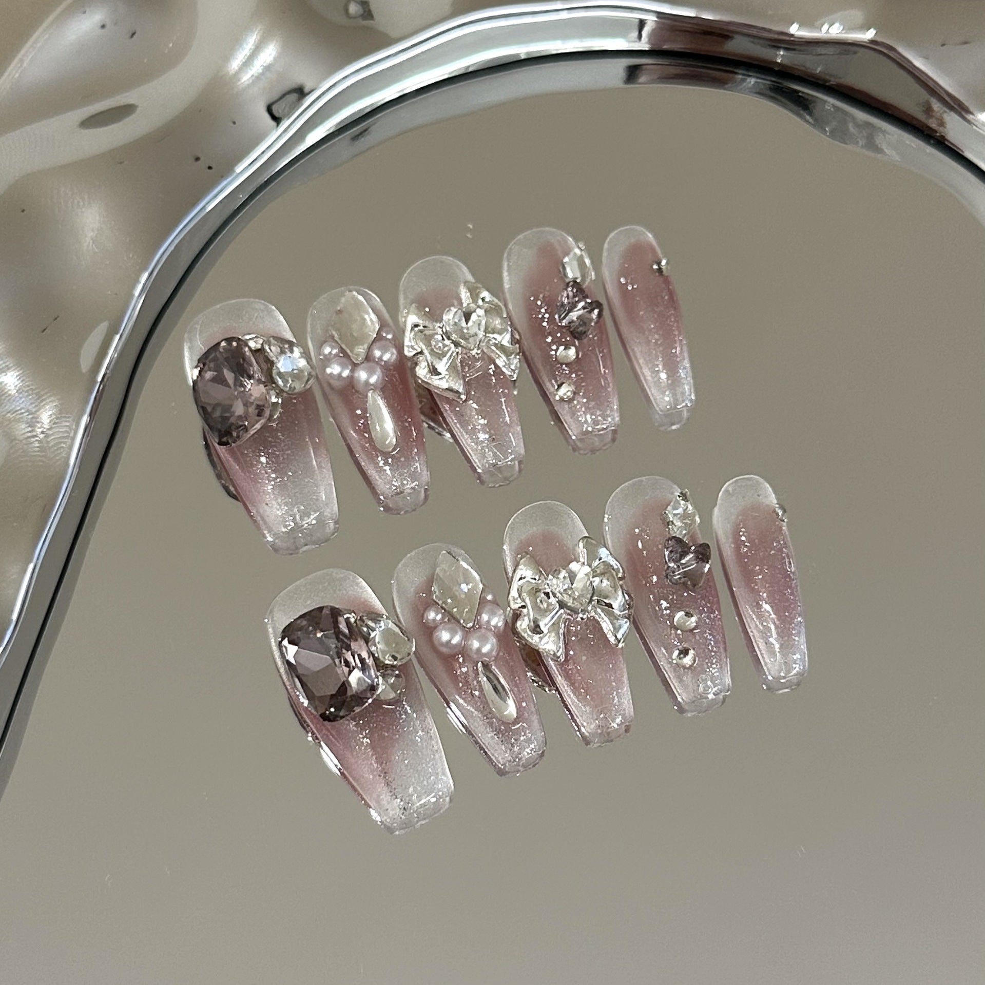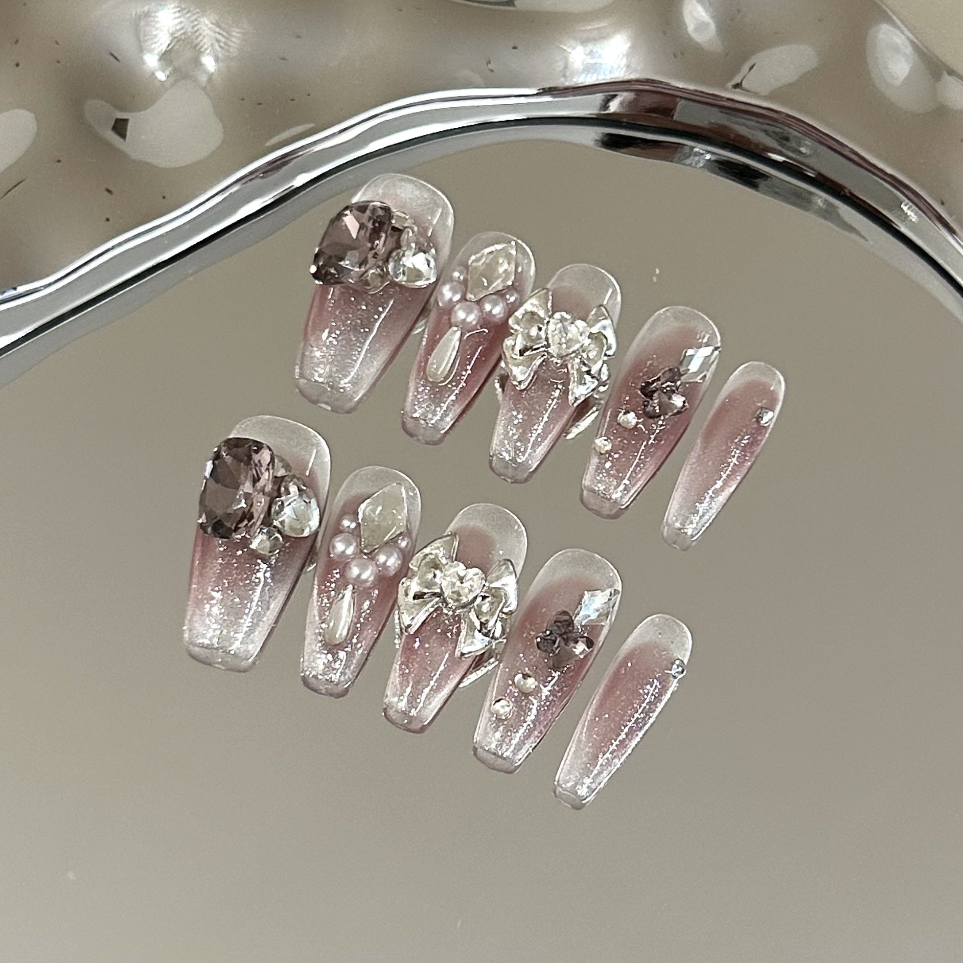 A dreamy blend of soft purple ombré, shimmering pearls, and delicate bows. Handcrafted elegance with a touch of playful charm. Pure luxury for your fingertips.