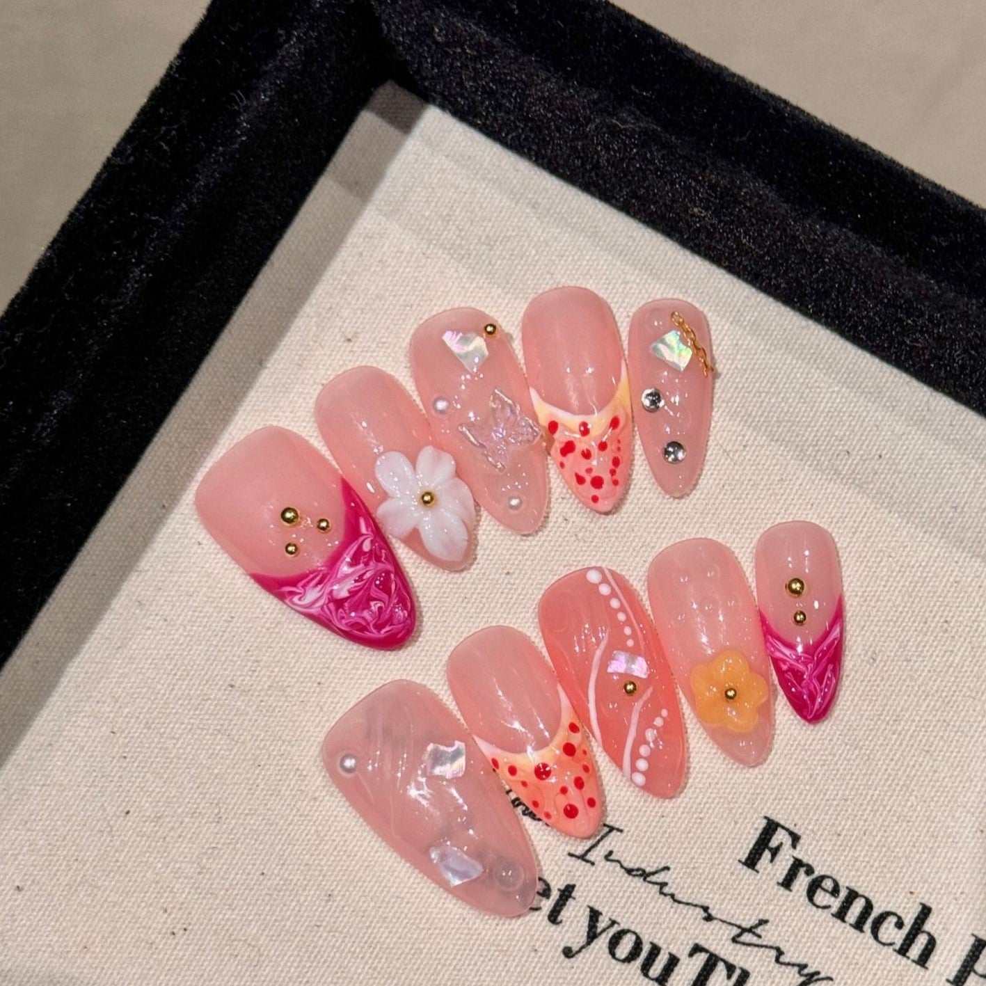 Embrace elegance with 'Blush Bloom'! Soft pink hues, delicate floral accents, gold beads, and shimmering shells create a harmonious, romantic design perfect for dates or parties. A touch of spring on your fingertips!