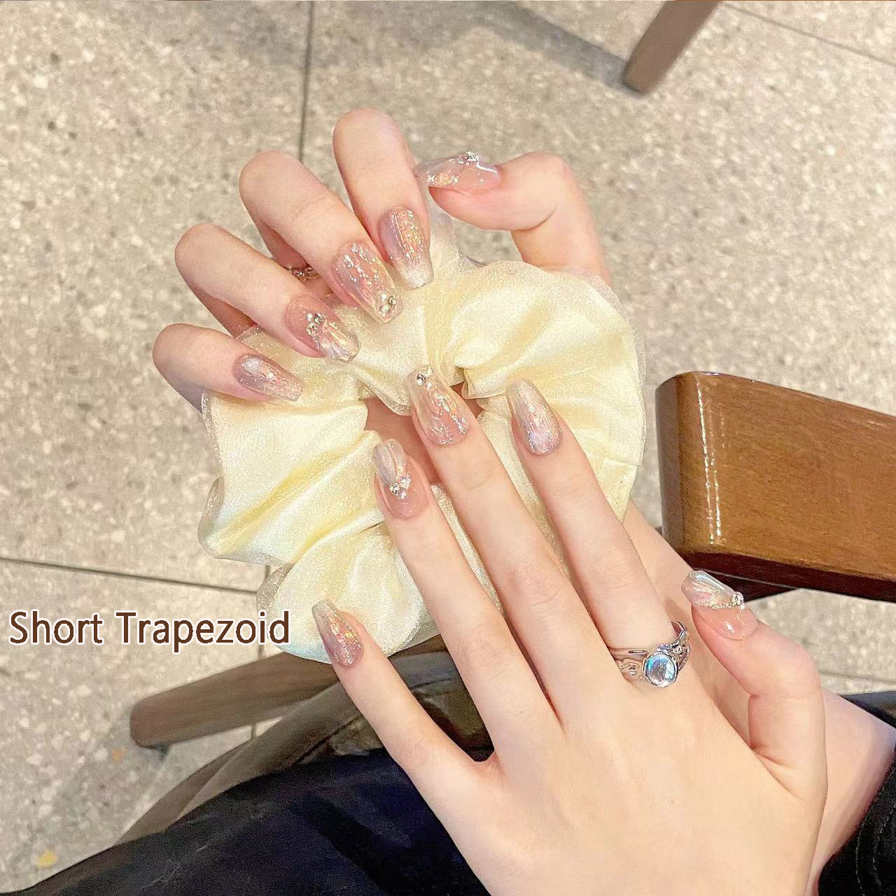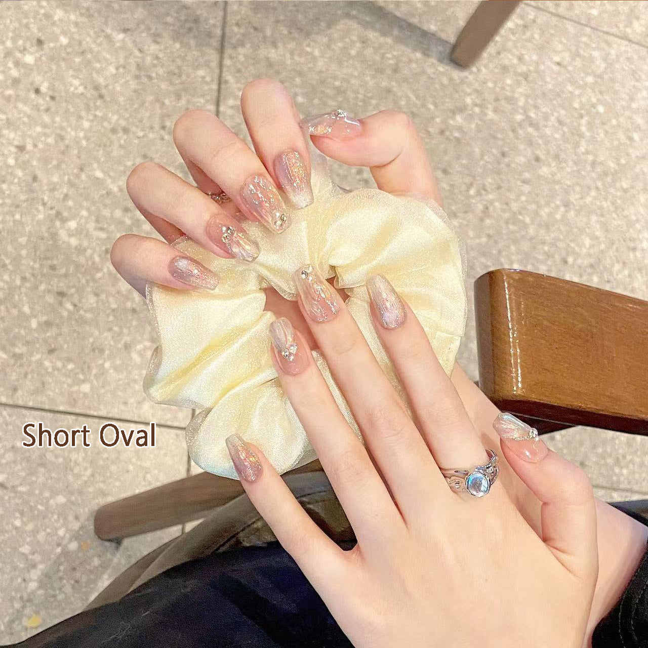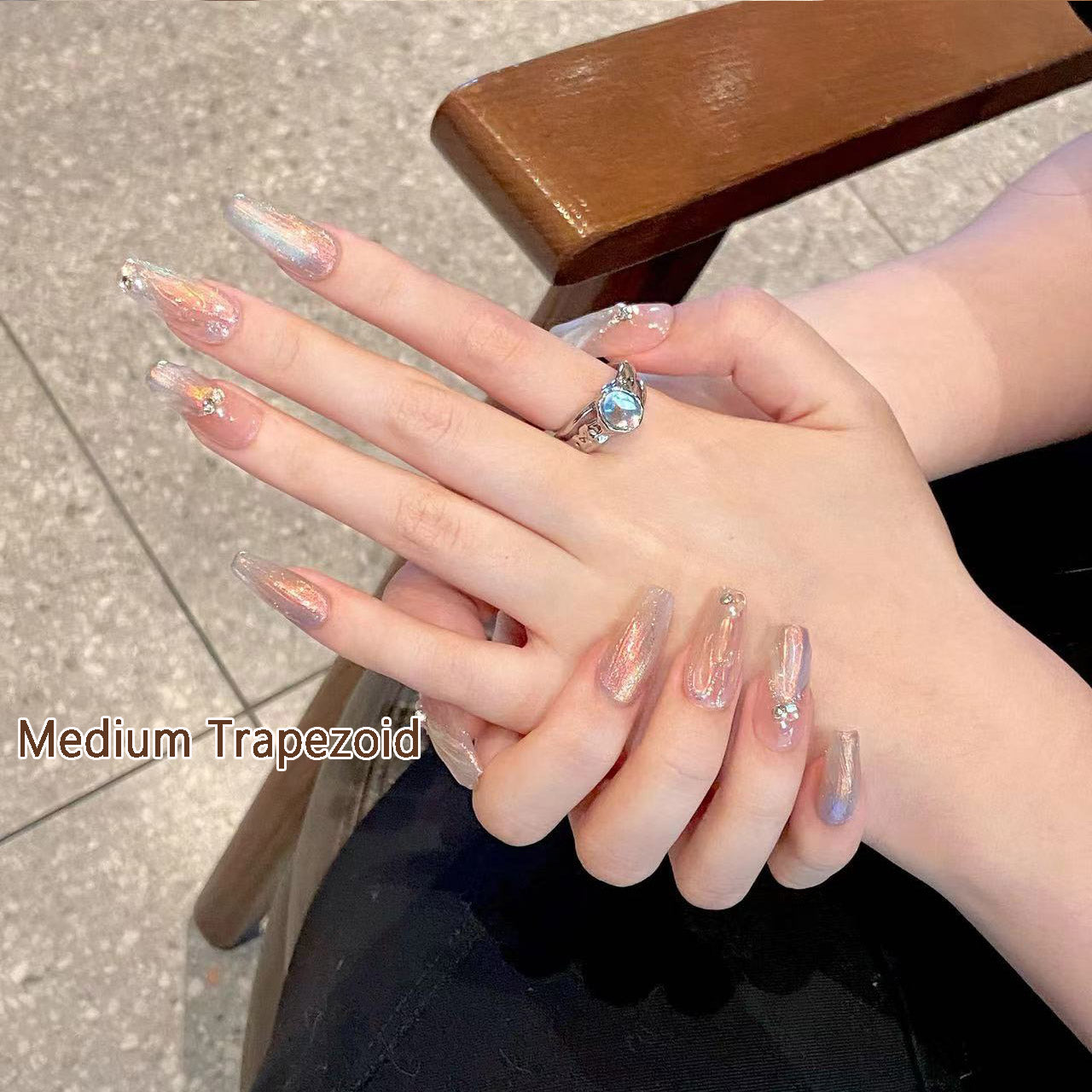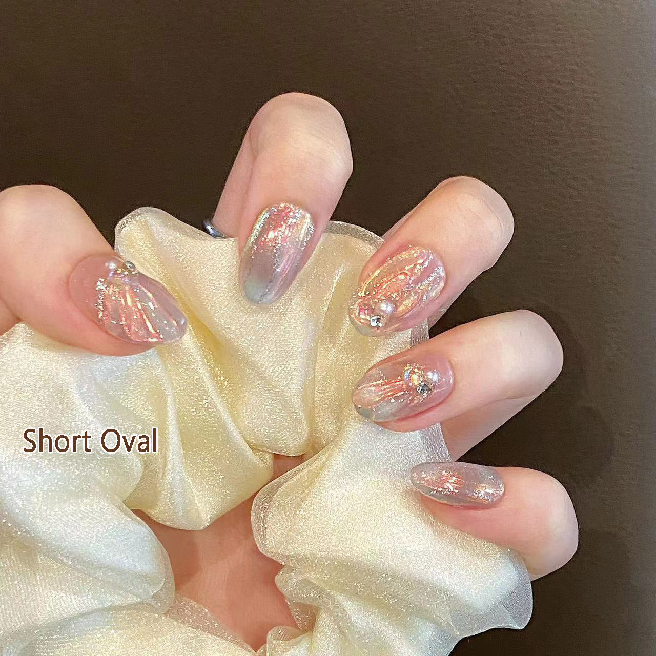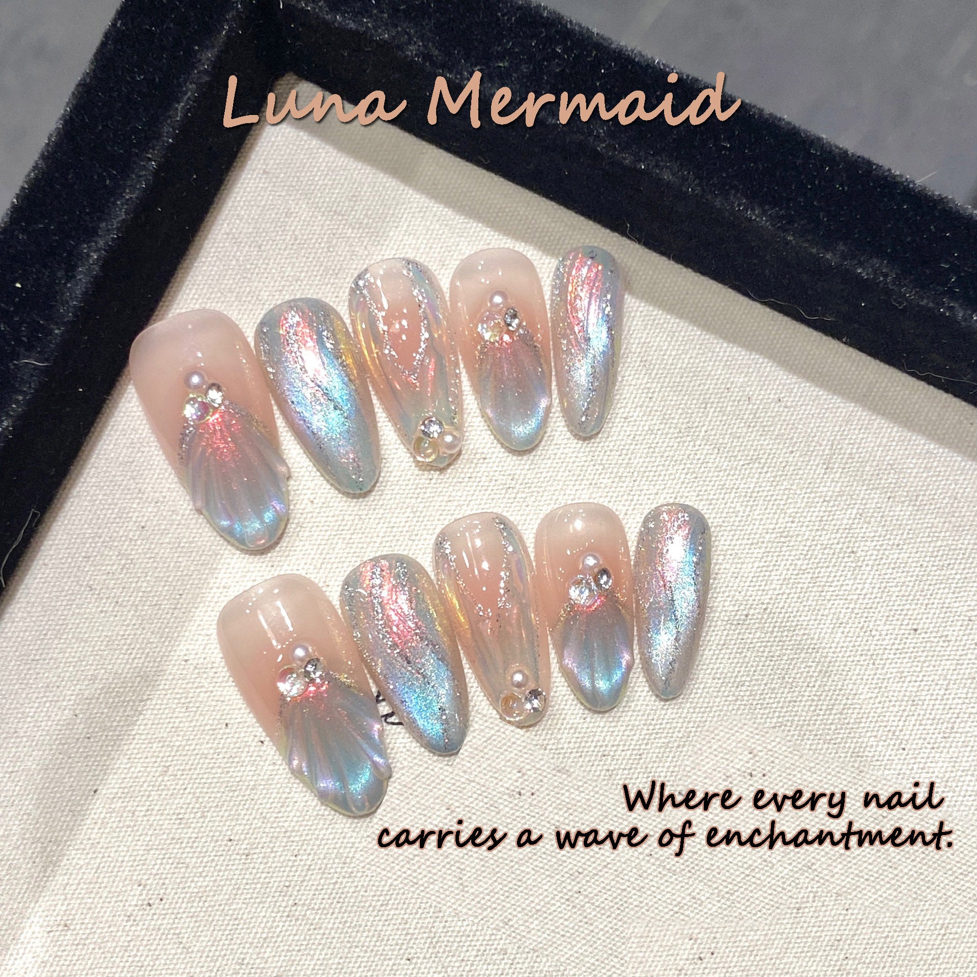 Embrace the ocean's magic with 'Luna Mermaid.' Soft pink hues, shimmering cat-eye blues, and pearl accents create a dreamy, mystical manicure perfect for enchanted evenings.