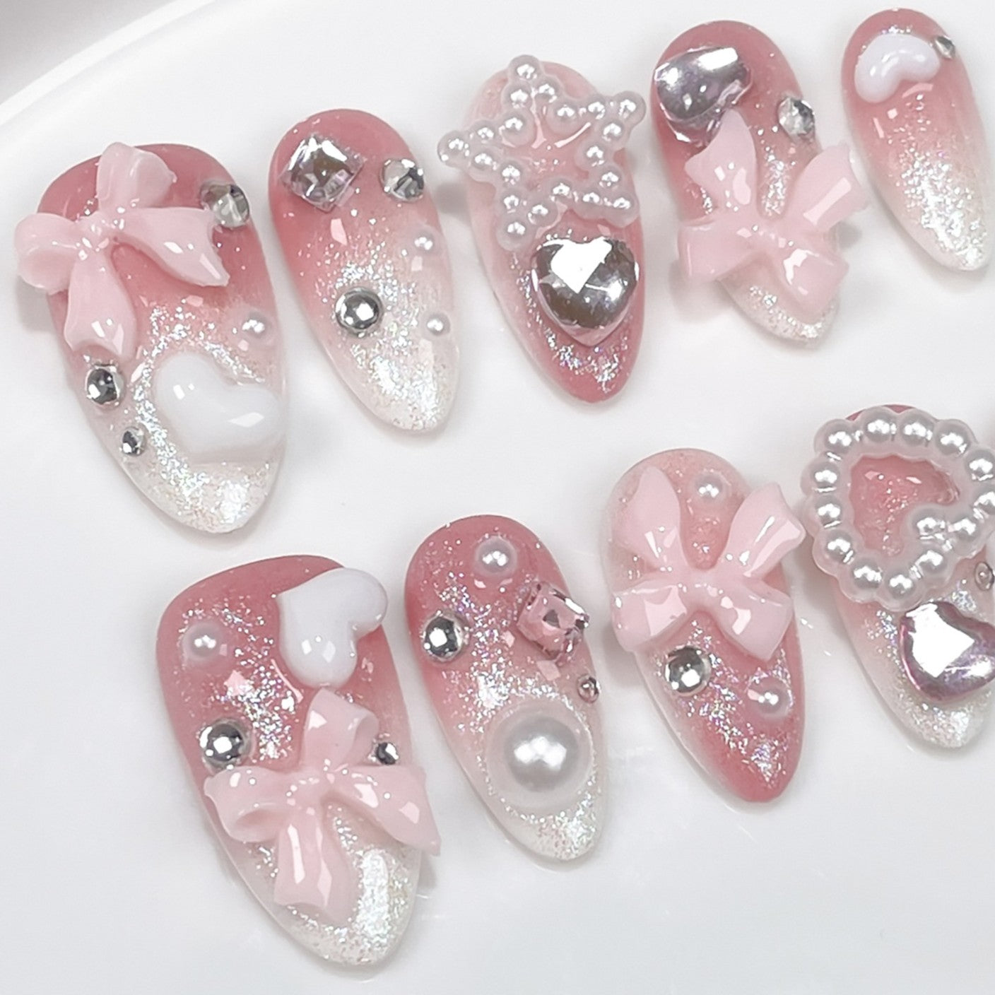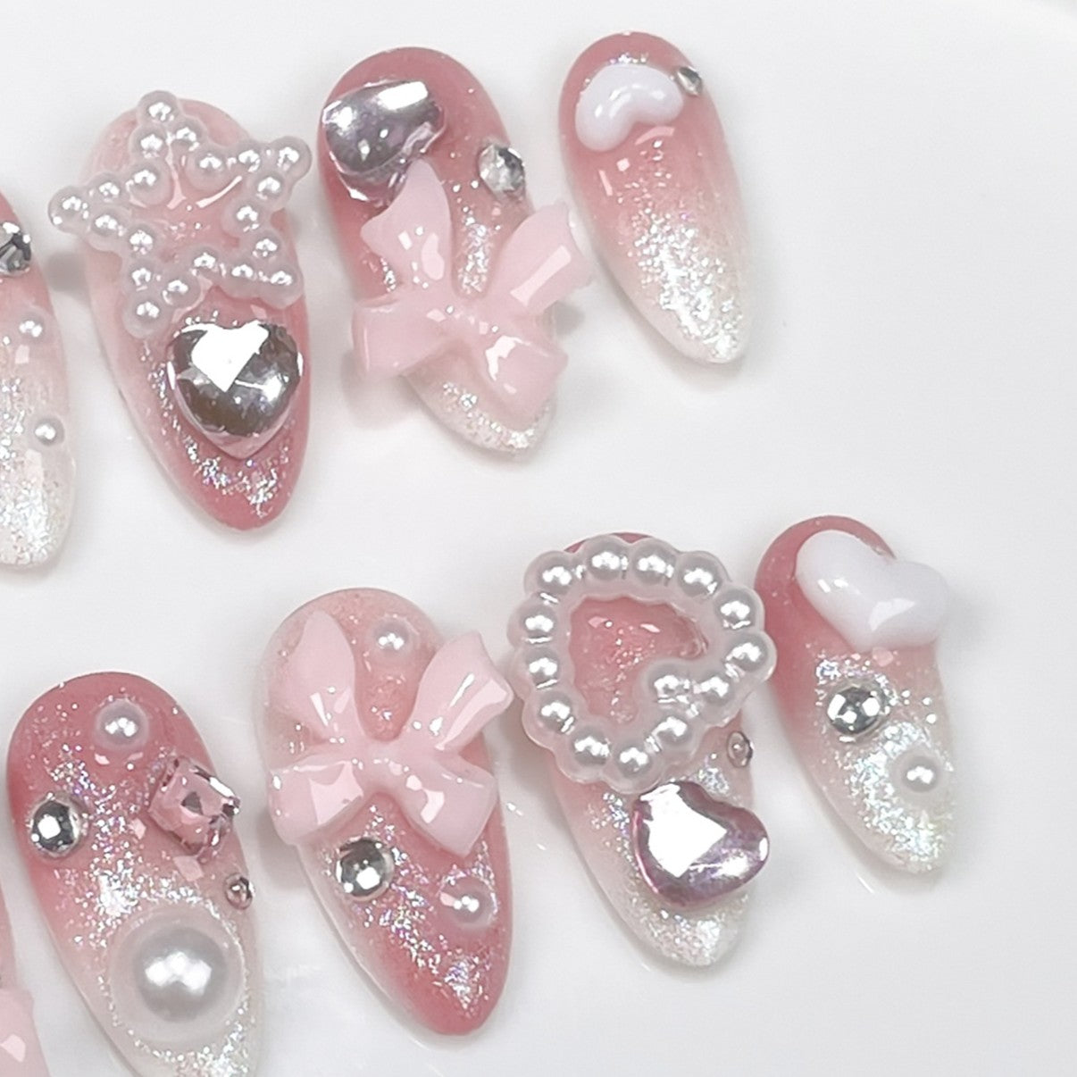 Delicate pink gradients meet dazzling silver sparkle, adorned with pearl stars and dainty ribbons. Each press-on nail is a love letter to romance, with heart charms and crystalline accents that catch the light like morning dew. Whimsical yet refined, this set transforms fingertips into a fairy-tale dream.