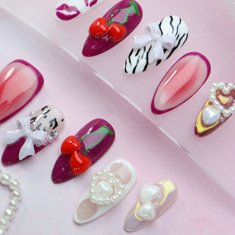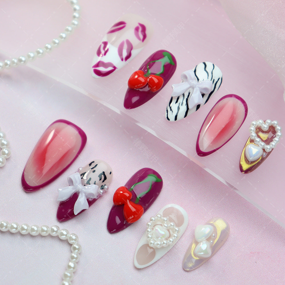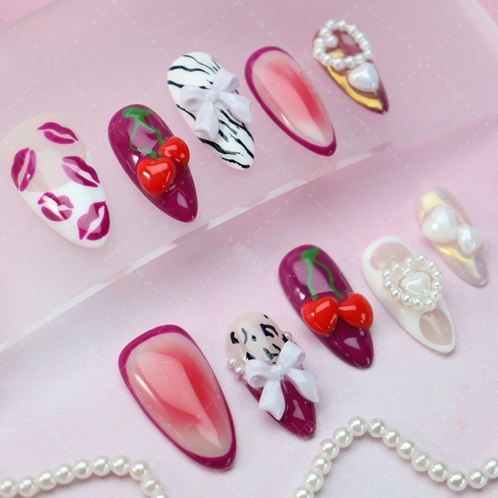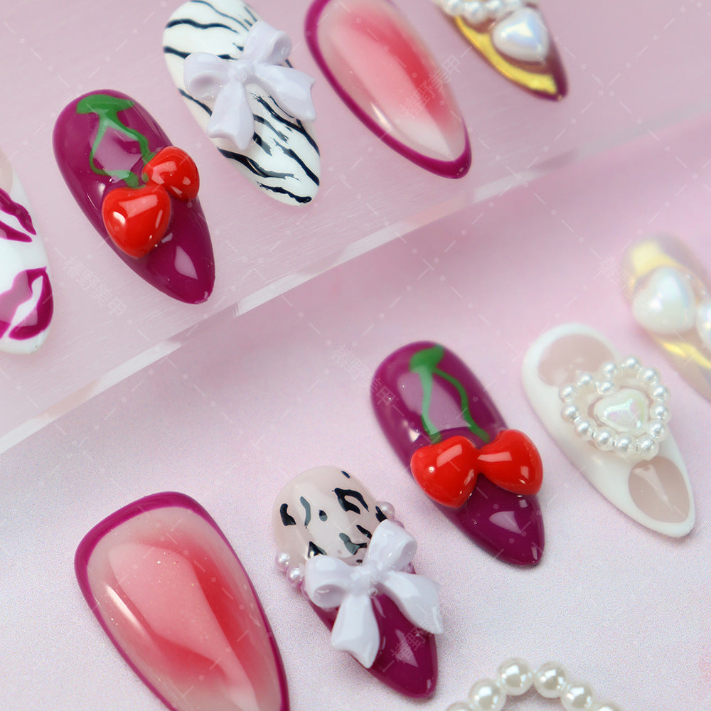Sweet meets sultry with 'Cherry Noir.' Juicy red cherries pop against moody purple, while zebra stripes and pearl hearts add a dash of rebellion—a manicure that’s as bold as it is playful.