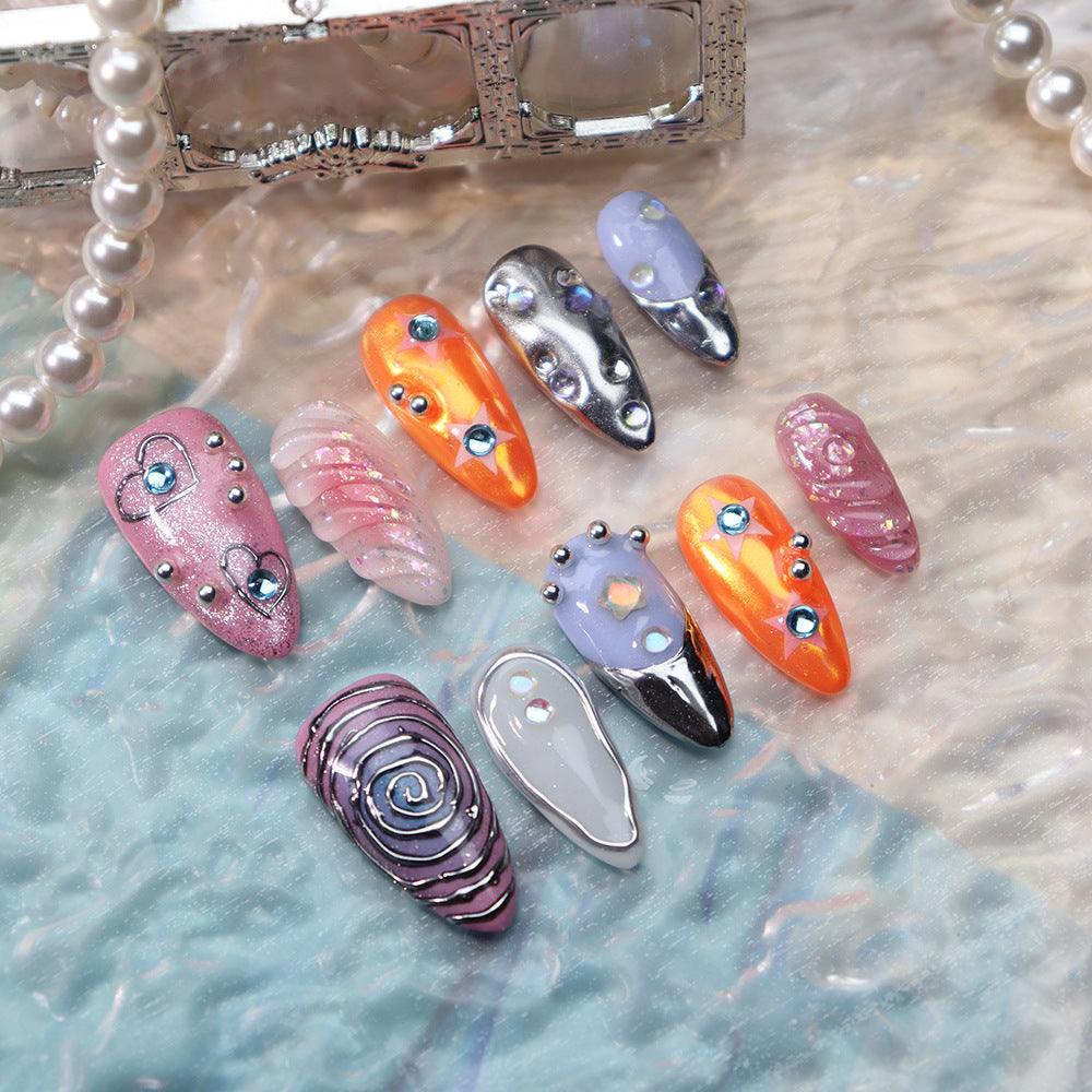 Step into the future with 'Neon Vortex'—where metallic swirls collide with prismatic gems in a hypnotic dance of light. This high-tech manicure turns fingertips into radiant portals of color and dimension.