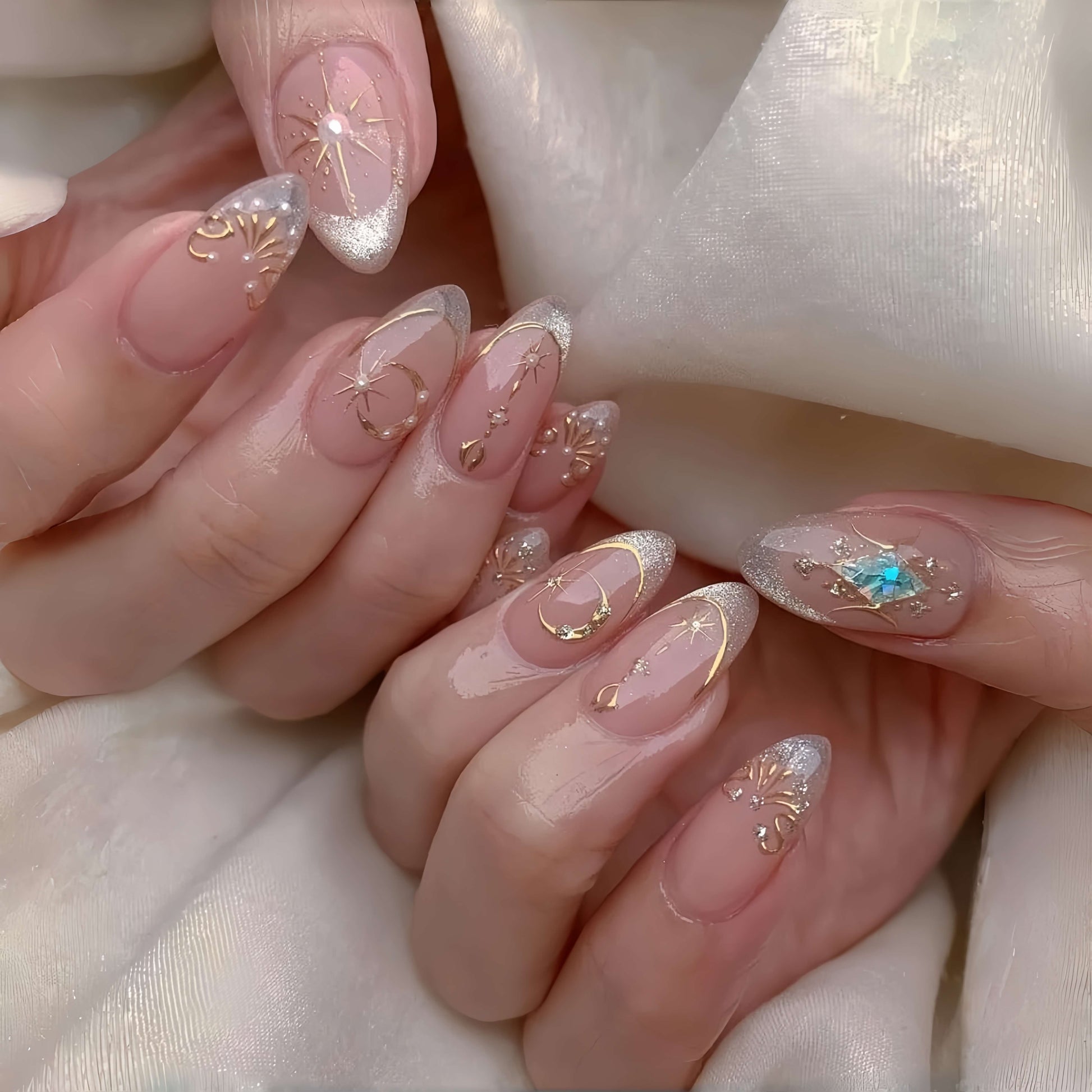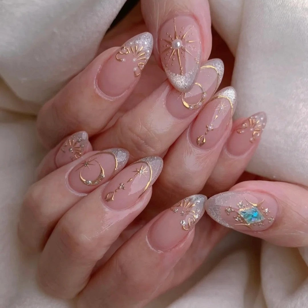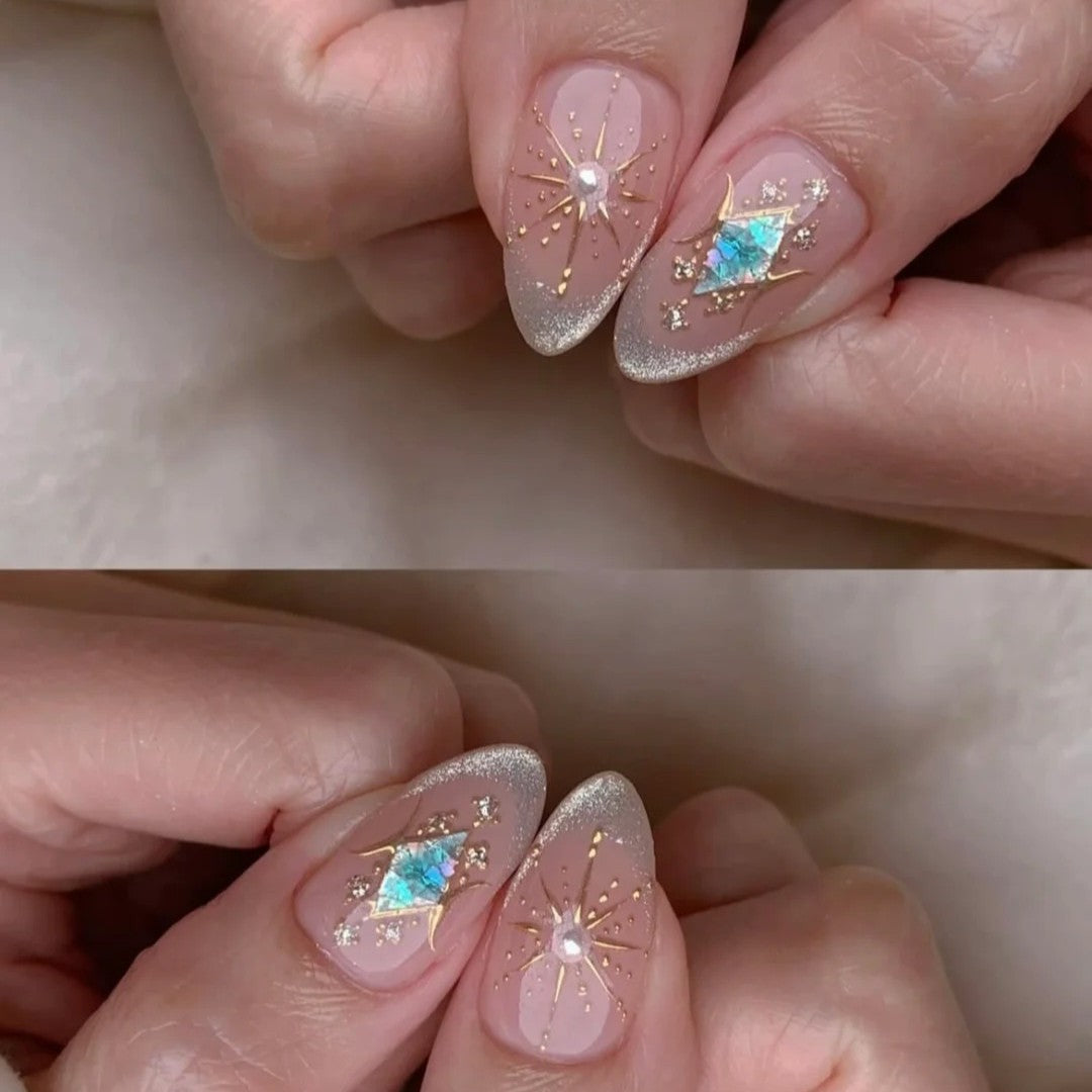 Slip into the cosmos with 'Stardust Veil'—where translucent petal-pink nails become a twilight sky. Golden constellations trace your fingertips, pearls glint like distant stars, and that single violet diamond? That’s your secret supernova.